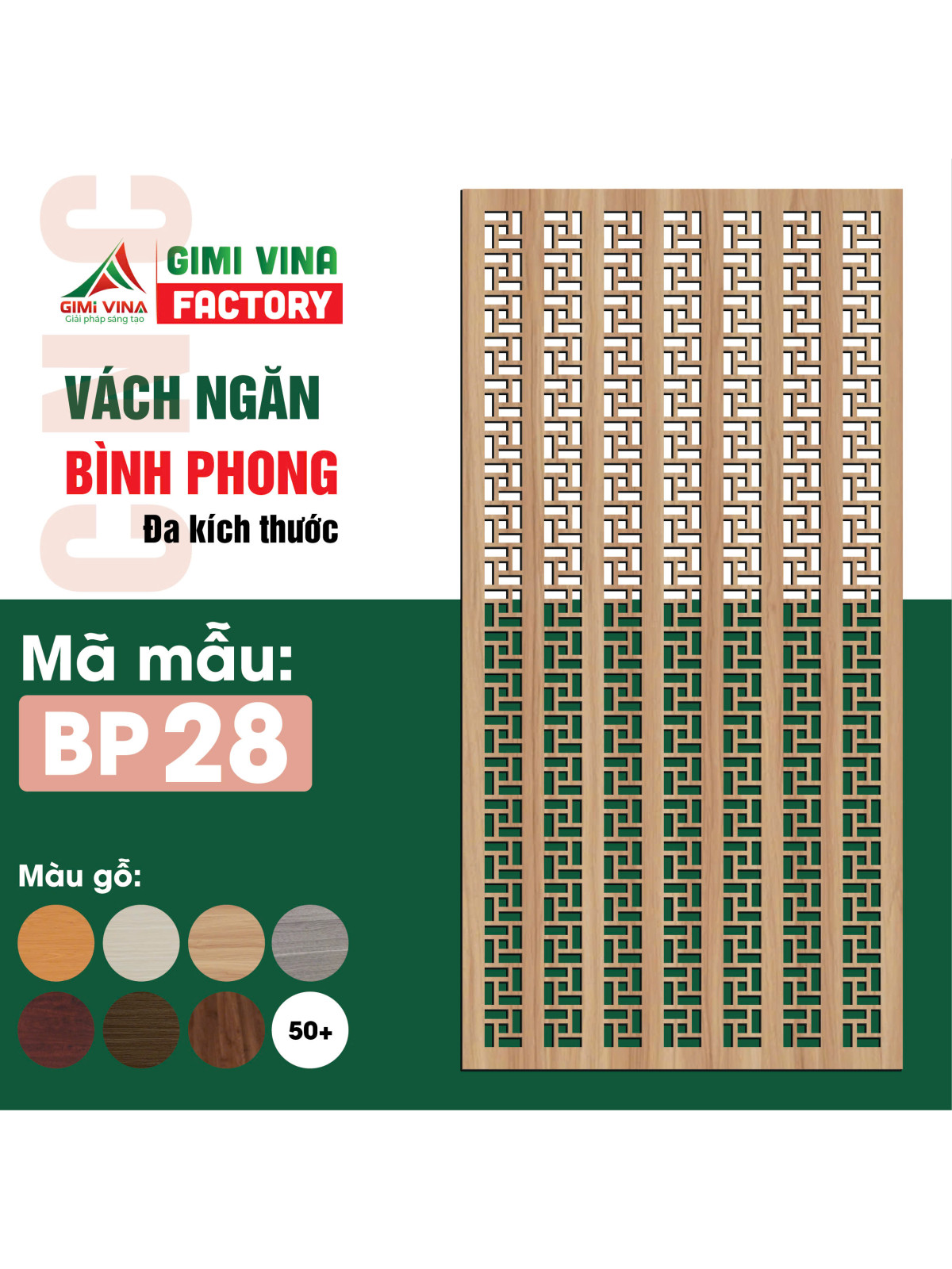 Bình phong vách ngăn gỗ BP28 nổi bật với thiết kế hoa văn họa tiết hình học lặp lại theo chiều dọc – tạo cảm giác ngăn chia nhưng vẫn thoáng đãng. Gỗ công nghiệp HDF cắt CNC sắc nét – bền bỉ, dễ lau chùi, bảo vệ môi trường.