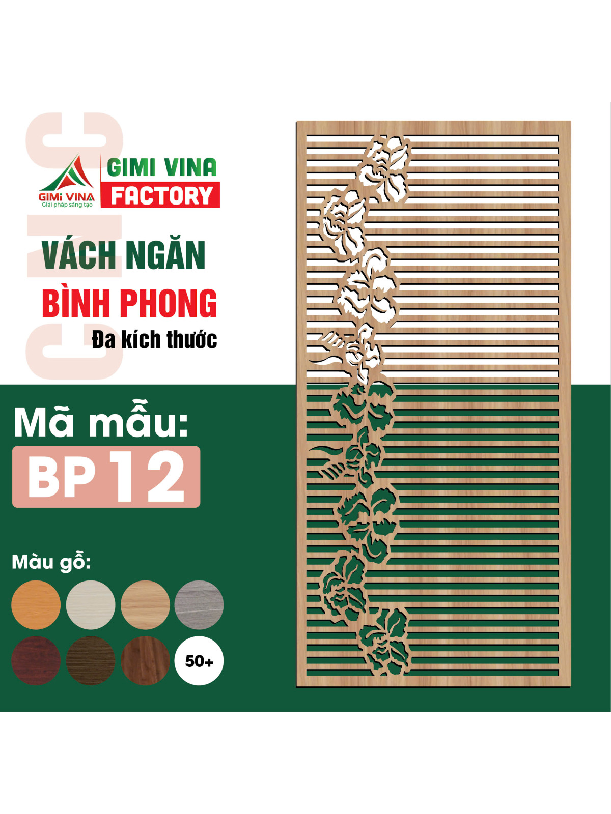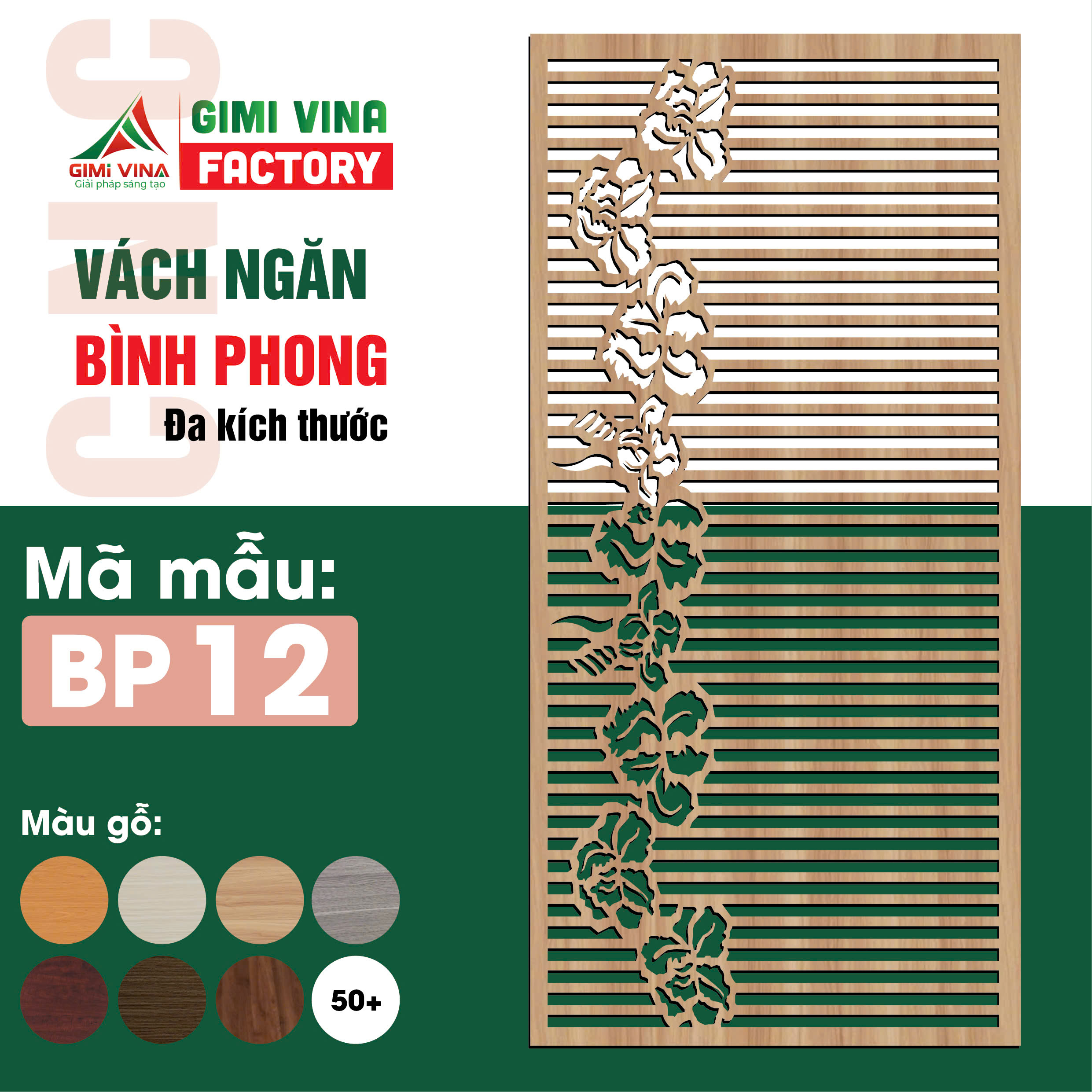 Vách ngăn bình phong gỗ BP12 với thiết kế nổi bật - Họa tiết mềm mại, tinh tế, mẫu BP12 gây ấn tượng với những đường cắt CNC sắc nét, kết hợp giữa các thanh ngang hiện đại và họa tiết hoa dây leo mềm mại.