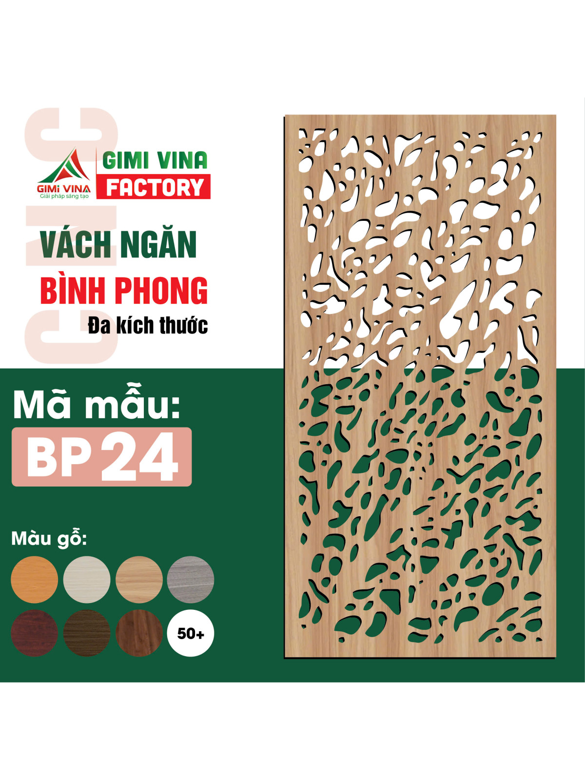 Vách ngăn bình phong gỗ BP24 với chất liệu gỗ công nghiệp cao cấp – gỗ HDF chống ẩm, mối mọt, dễ vệ sinh, độ bền cao. Gia công cắt CNC tạo những đường nét tinh tế với hơn 50+ màu vân gỗ sang trọng theo tone nội thất.