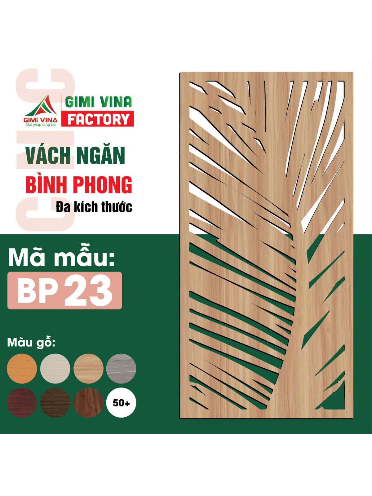 Vách ngăn bình phong gỗ cao cấp BP23 được gia công cắt CNC chính xác – bề mặt hoàn thiện mịn màng, thẩm mỹ. Chất liệu gỗ HDF dày từ 12mm chống ẩm, mối mọt – bền bỉ theo thời gian. Gimi Factory xưởng gia công bình phong vách ngăn theo yêu cầu tại Cần Thơ.